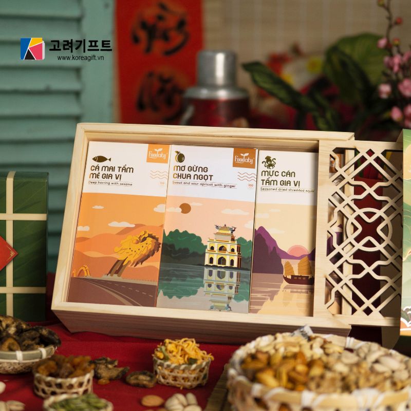 – Thành phần: Cá Mai Tẩm Mè hộp giấy 150gr, Mực cán tẩm gia vị vip hộp giấy 100gr, Mơ gừng Hà Nội hộp giấy 300gr